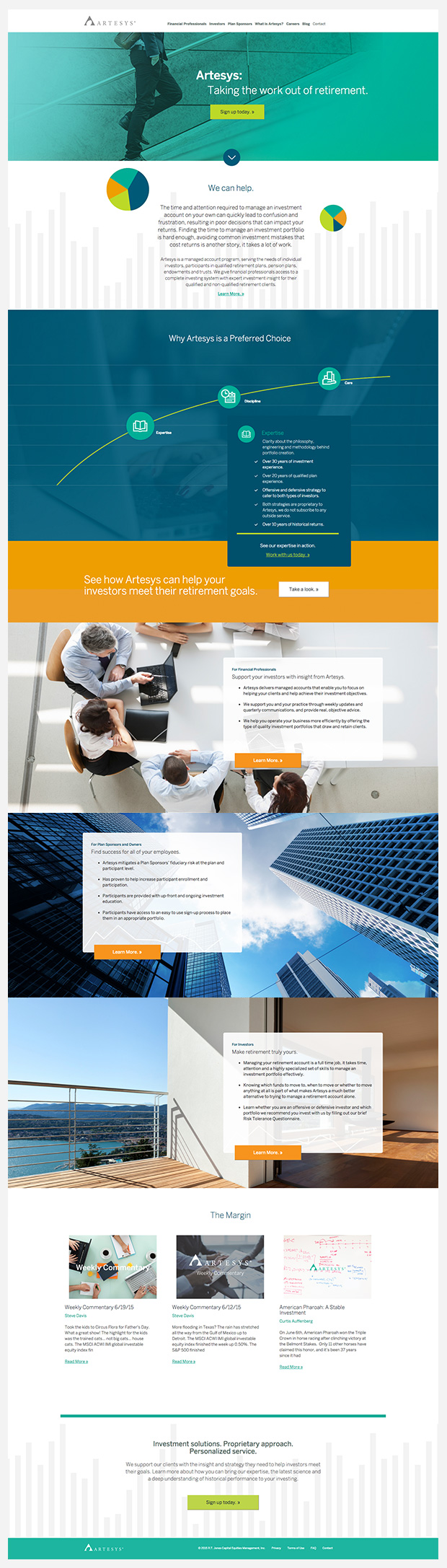 In addition to being a hub for information, the homepage also anchors the story by illustrating how Artesys is different. To keep visitors interested along the way, we took an animated approach for both the web design and development. As visitors scroll, pieces move and information flows – revealing small bits of content that break down the tricky details behind investing with Artesys.